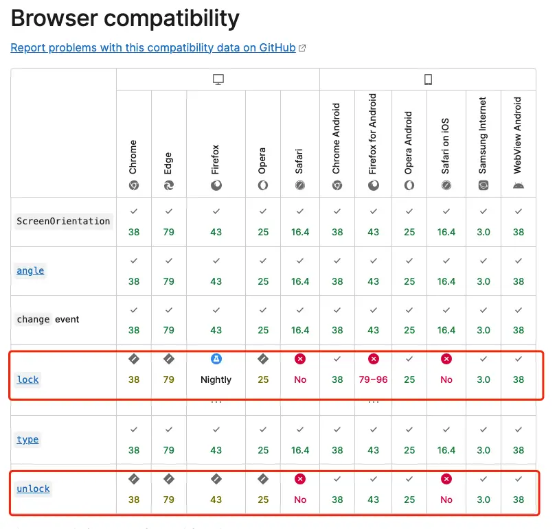 - ✧文檔地址:https://developer.mozilla.org/en-US/docs/Web/API/ScreenOrientation