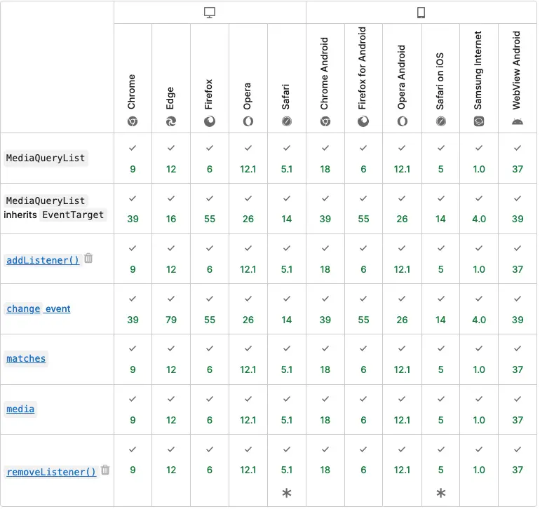 - 文檔:https://developer.mozilla.org/en-US/docs/Web/API/MediaQueryList