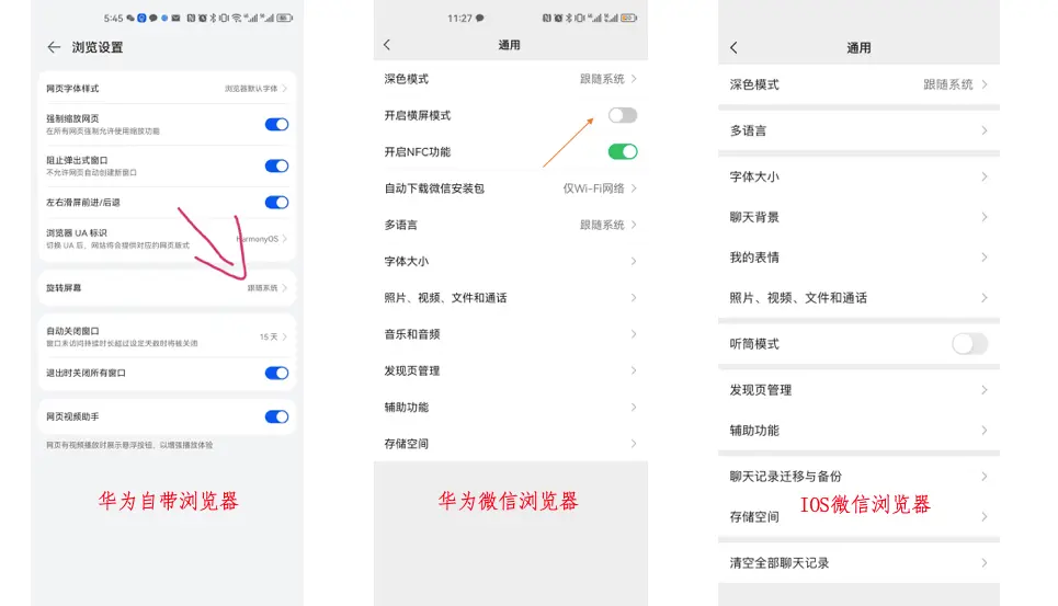 - ○在安卓中不同app有不同的處理形式,比如微信內不支持橫屏、華為自帶瀏覽則是提供設置是否要跟隨系統