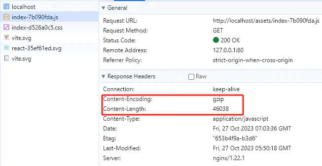 Content-Encoding為gzip就表示設置成功了