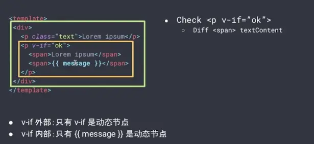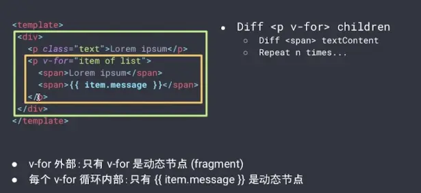 即從組件模板中提取出動態節點、動態代碼塊,做diff時,只需要比較這些動態區域,而忽略掉靜態節點,從而提升性能。