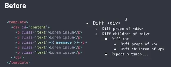 diff算法:diff的工作量和組件模板大小成正相關。即使模板內只有少量的動態節點,也需要遍歷整個組件去執行diff。