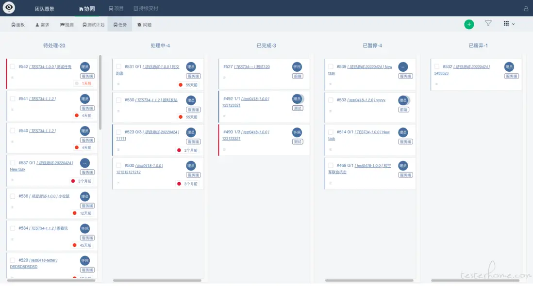 - 需求分解和任務分配:TeamVision支持將需求分解為多個子任務,併為每個任務分配負責人,以便團隊成員清晰地瞭解自己的責任範圍,可為任務設置優先級、截止日期、標籤等信息。此外,還提供了任務看板功能,任務看板是一種敏捷開發中的可視化工具,它能夠展示任務在不同階段的進度。在TeamVision中,任務看板被劃分為待辦、進行中、已完成等多個列,以幫助團隊快速瞭解項目的整體狀況。