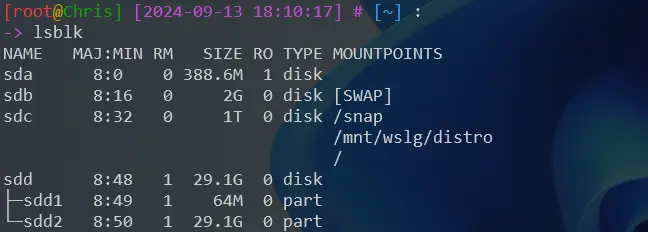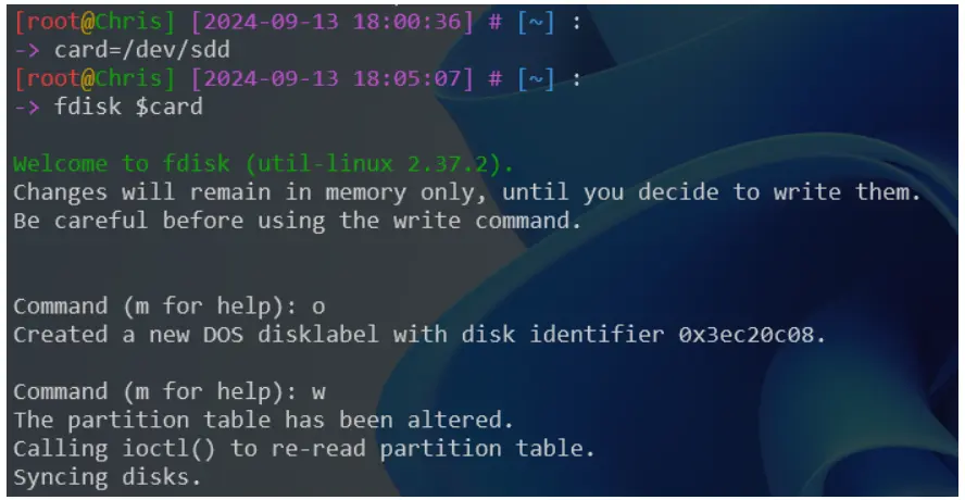 [root@Chris] [2024-09-13 18:00:33] # [~] : -> lsblk NAME MAJ:MIN RM SIZE RO TYPE MOUNTPOINTS ..... sdd 8:48 1 29.1G 0 disk └─sdd1 8:49 1 29.1G 0 part - 2)創建 DOS 分區表: