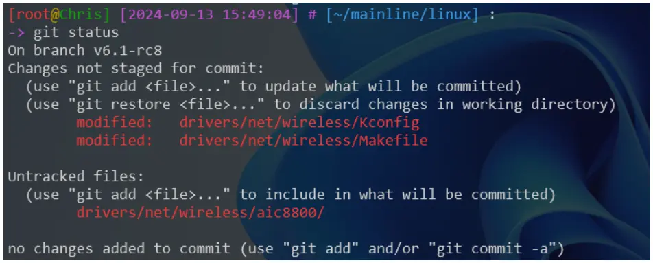 # linux 源碼倉庫在 gitlab、github 上由 Linus Torvalds 維護 git clone https://git.kernel.org/pub/scm/linux/kernel/git/torvalds/linux.git git clone https://github.com/torvalds/linux.git # 由於 github 連接不穩定等原因,我們可以通過其它方式獲取源碼 —— 由 Gitee 官方 # 提供的 Linux 源碼的鏡像倉庫,每天同步一次。 git clone https://gitee.com/mirrors/Linux.git # 由於這次編譯主要是為了支持 Tenda 的 aic8800 無線網卡,其支持的內核版本為 V3.10-V6.2, # 目前(2024.9.13)最新的 v6.1 版本為 v6.1-rc8,所以這裏選擇 v6.1-rc8 版本。 # 查看內核版本分支 git branch -a # 查看所有分支 git fetch --tags # 獲取最新標籤 git tag | grep v6 # 查看並篩選標籤名 # 根據標籤創建分支 git checkout tags/v6.1-rc8 # 已經做了修改,又需要在內核源碼分支間切換時,可以使用 git stash,如: # git stash [save "message"] # 將未提交的更改保存到暫存區,並指定名稱為 message(可省略) # git stash pop # 恢復暫存區的更改