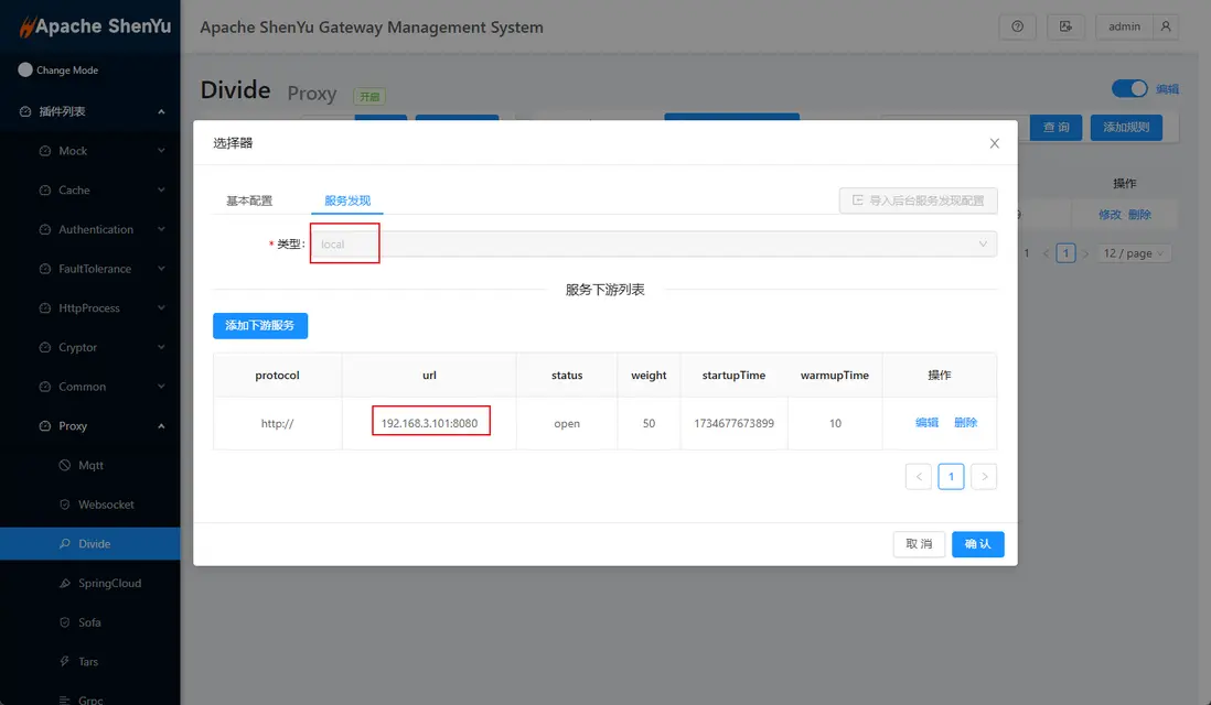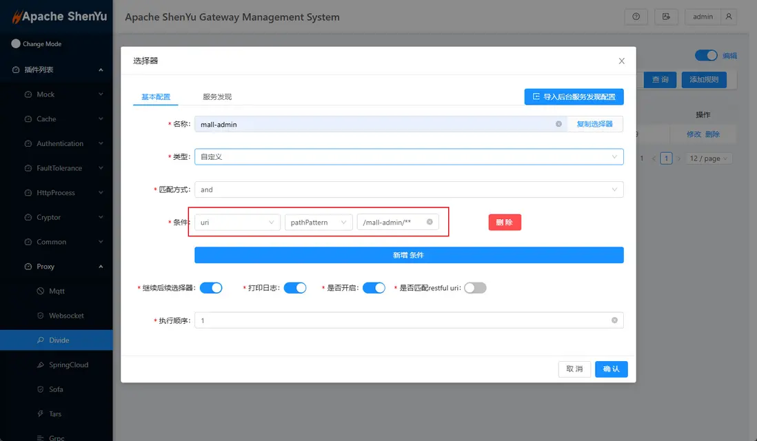 插件列表->Proxy->Divide功能中先添加選擇器,這裏以mall-admin為例,首先是基本配置;