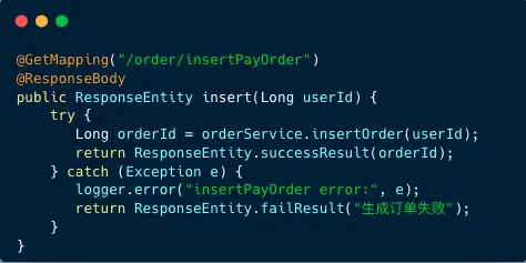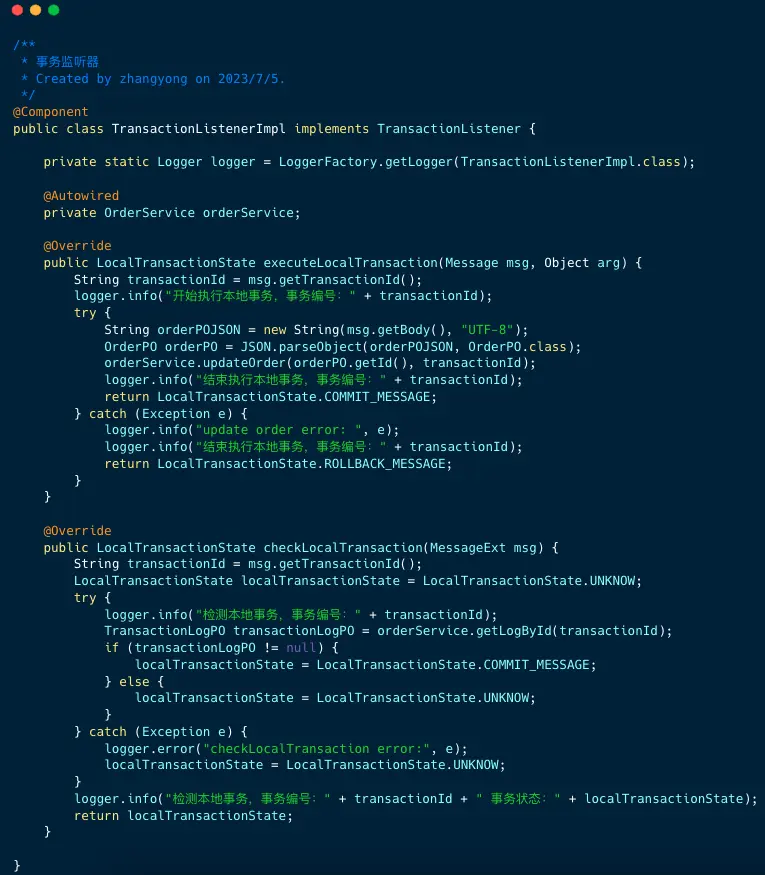 需要注意的是: orderService.updateOrder 方法添加了事務註解,並將修改訂單狀態和插入事務日誌表放進一個事務內,避免訂單狀態和事務日誌表的數據不一致。