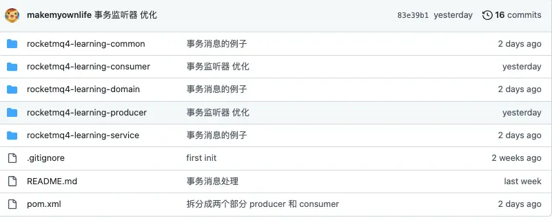最後我們創建一個 Demo 工程,生產者模塊用於創建支付訂單、修改支付訂單成功,消費者模塊用於新增積分記錄。