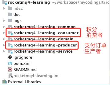 為了便於大家理解事務消息 ,筆者新建一個工程用於模擬支付訂單創建、支付成功、贈送積分的流程。