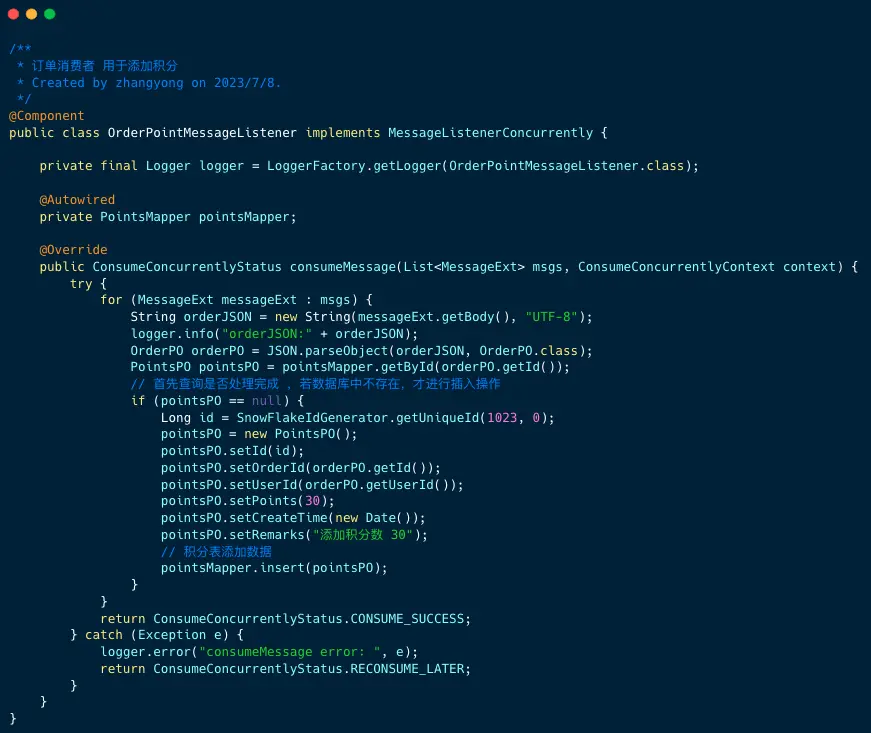 在消費監聽器邏輯裏,冪等非常重要 。當收到訂單信息後,首先判斷該訂單是否有積分記錄,若沒有記錄,才插入積分記錄。