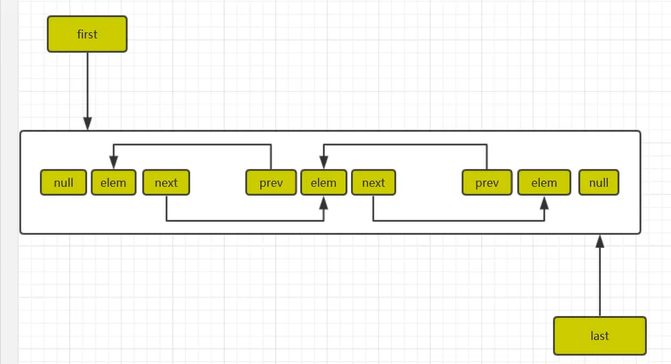 LinkedList基於雙向鏈表+內部類Node<>泛型集合實現,初始化沒有默認空間大小,根據頭尾節點查找元素,下面先看下雙向鏈表的數據結構圖