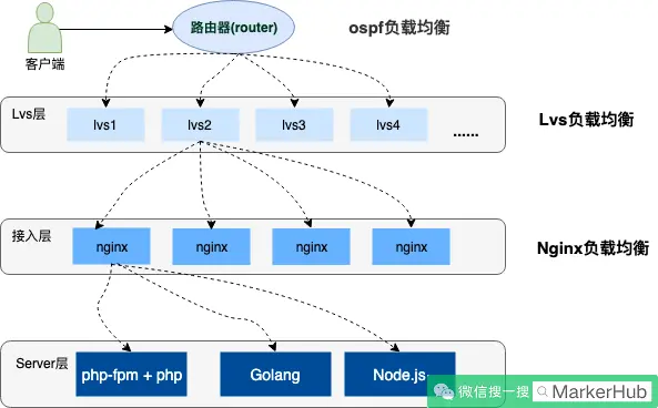 上圖中描述了用户請求到服務器經歷了三層的負載均衡,下邊分別簡單介紹一下這三種負載均衡:
