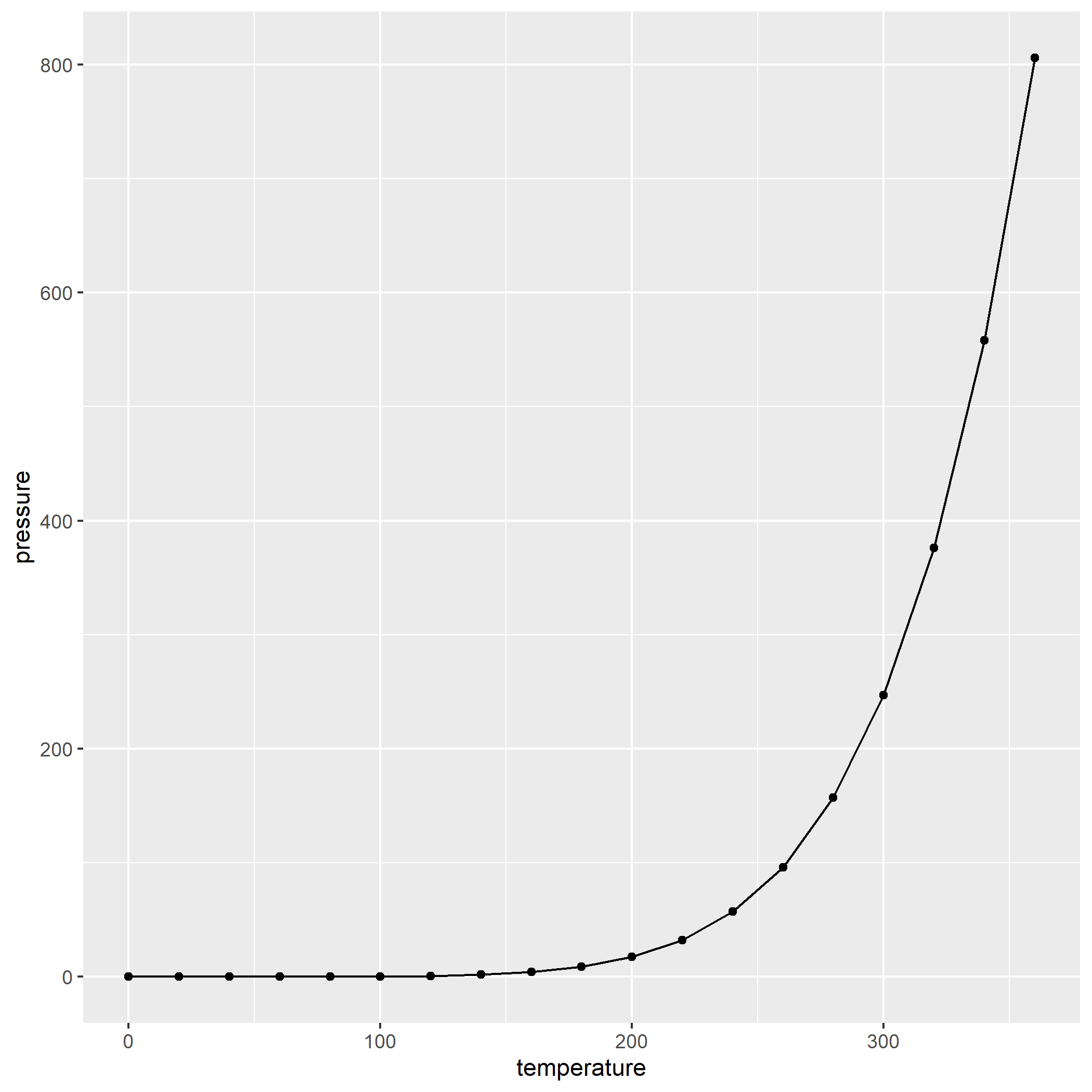 p <- ggplot(pressure, aes(x = temperature, y = pressure)) +