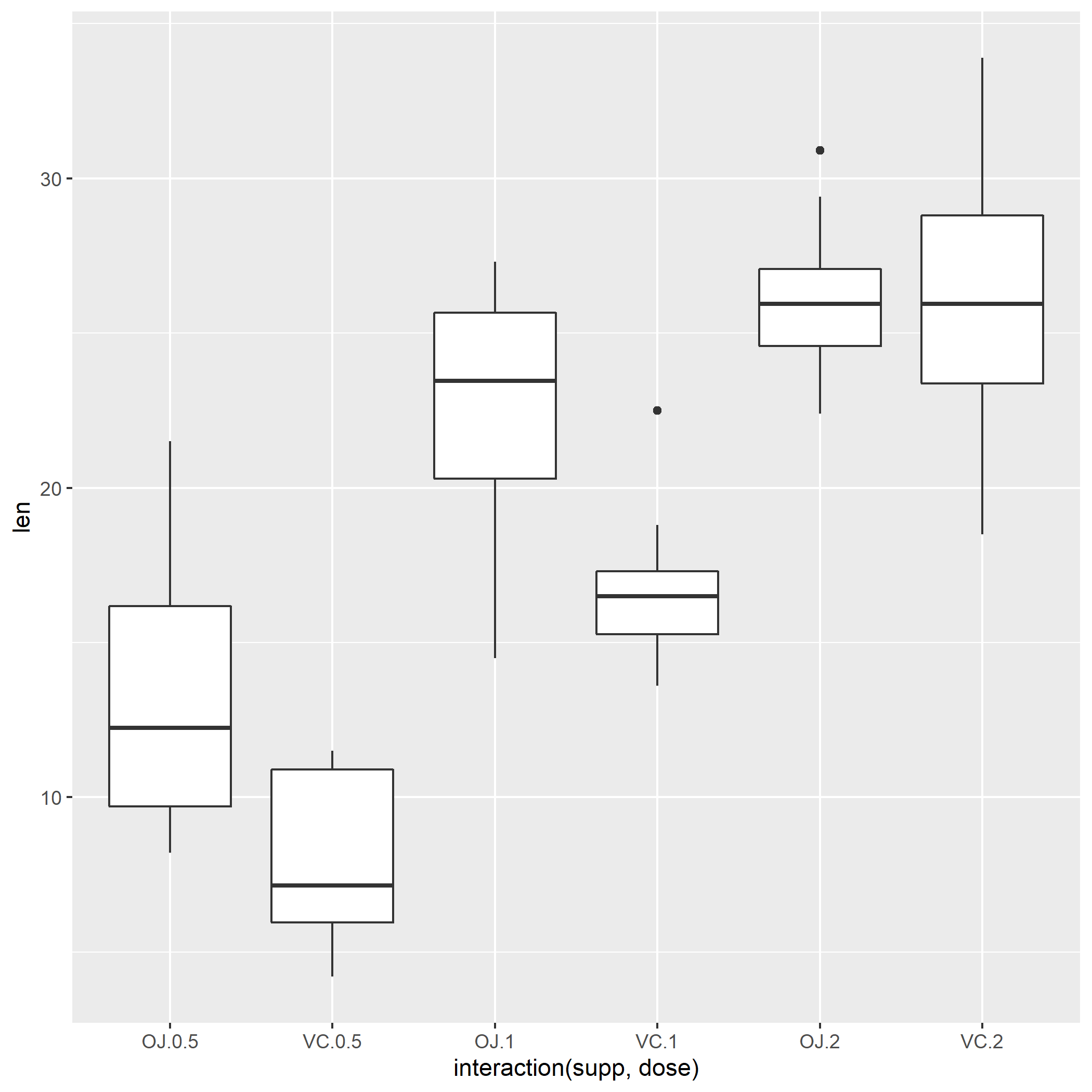 p <- ggplot(ToothGrowth, aes(x = interaction(supp, dose), y = len)) +