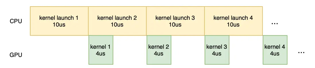 GPU kernel大體上可以劃分為傳輸數據、kernel啓動、kernel計算等幾個階段,其中每個kernel的啓動需要約10𝞵𝘀左右。大量的小算子導致每個kernel的執行時間很短,kernel啓動的耗時佔了大部分。相鄰的kernel之間需要通過讀寫顯存進行數據的傳輸,產生大量的訪存開銷。而GPU的訪存吞吐遠遠低於計算吞吐,導致性能低下,GPU利用率並不高。