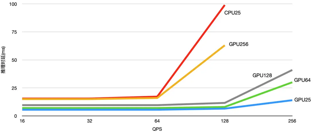 下圖對比了在不同的QPS下(x軸),GPU模型在各BatchSize下的推理時延(y軸)。GPU模型在BatchSize=128以下,推理耗時差異不明顯,較大的BatchSize更有利於吞吐;對比BatchSize=256的GPU模型與BatchSize為25的CPU模型,在QPS低於64的情況下,二者推理耗時基本持平;QPS超過64的情況下,GPU的推理時延低於CPU。GPU的吞吐相比CPU提升了10倍。