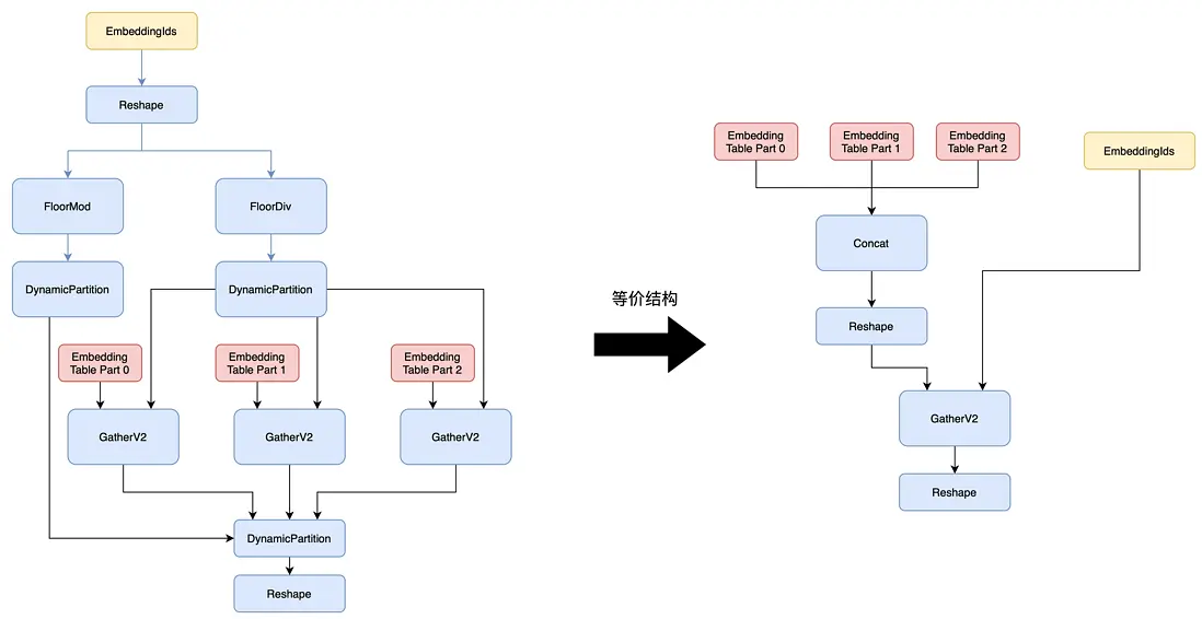 例如,TensorFlow原生EmbeddingLookup結構,為了支持分佈式訓練,會對Embedding表進行切分,產生DynamicPartition和ParallelDynamicStitch等動態算子。這些動態算子不被TVM支持,導致TF-TVM圖切分過於細碎。為了讓TF-TVM切圖更完整,我們通過圖替換,對這種結構進行修改,通過將Embedding分表提前合併,得到簡化的EmbeddingLookup結構。