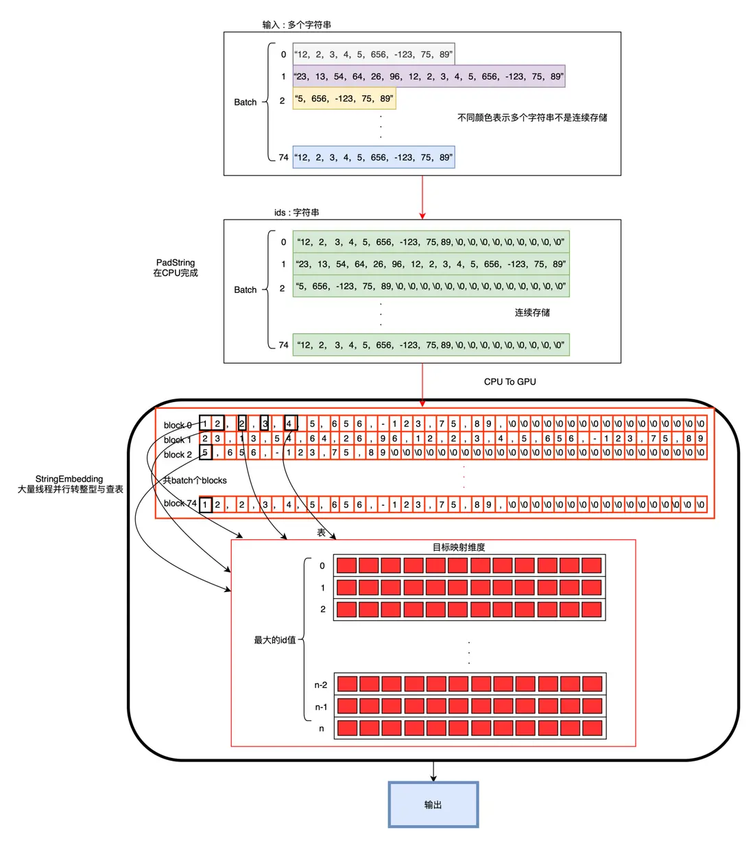 如圖所示,PadString算子在CPU端將多個字符串按最大長度進行補齊,拼接成一個內存連續的uint8類型Tensor,以便一次性傳輸到GPU。StringEmbedding接收到補齊後的字符串後,利用GPU並行計算的特性,協同大量線程完成字符串的切分與查表操作。在涉及規約求和、求前綴和等關鍵過程中,使用了GPU上的Reduce/Scan算法,編碼過程使用warp_shuffle指令,不同線程通過寄存器交換數據,避免了頻繁訪存的開銷,獲得了很好的性能。