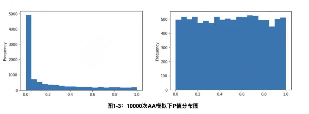 案例二:不可忽視的方差與P值計算陷阱,以及求和型統計量、ROI指標等高階評估方法訴求。AB實驗主要是通過在某個設定的抽樣機制下,觀察抽樣的樣本來推斷總體的提升效果,並通過顯著性檢驗輔助判斷實驗組、對照組之間差異是真實策略還是抽樣噪音帶來的。在該過程中通常需涉及大量統計學理論,包括方差、檢驗方式和P值計算等,稍有不慎容易掉入統計陷阱,難以得出可靠的實驗結論。例如當分流單元與分析單元不一致時,錯誤的方差計算方式容易低估實際方差,導致假陽性。如圖1-3左側所示,在真實策略沒有任何提升的情況下,分析單元細於分流單元時出現錯誤判別策略有效的概率接近50%。正確的做法應該是先聚合到分流單位,再應用Delta技術推導的正確方差計算公式,如圖1-3右側所示,在正確方差計算下如果真實策略沒有任何提升,P值近似服從均勻分佈,以及假陽性錯誤率基本控制在指定的顯著性水平5%以內。