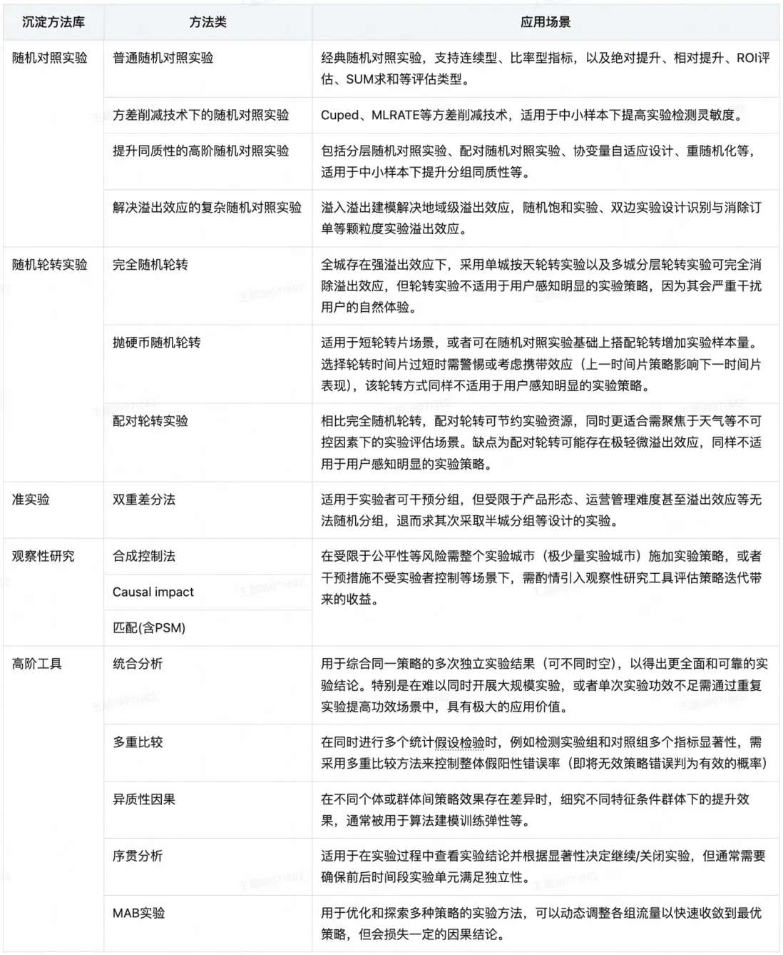 在上述大體流程下部分實驗場景同樣存在方法升級,下表簡要展示實驗方法庫及其適用場景,詳細方法內容將在本白皮書後續第3~7章節中重點展開與討論。同時大部分方法也已集成於履約SDK分析引擎,線上調用與線下分析詳情,大家可參閲白皮書的第8章節。
