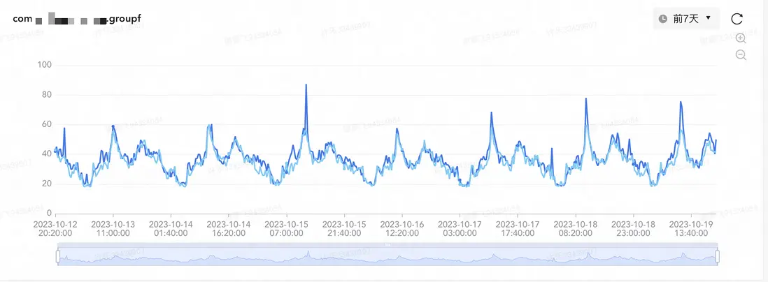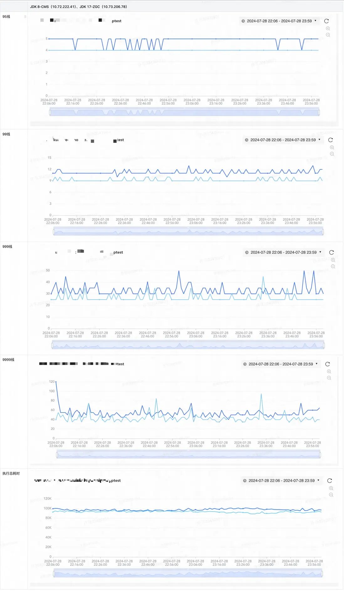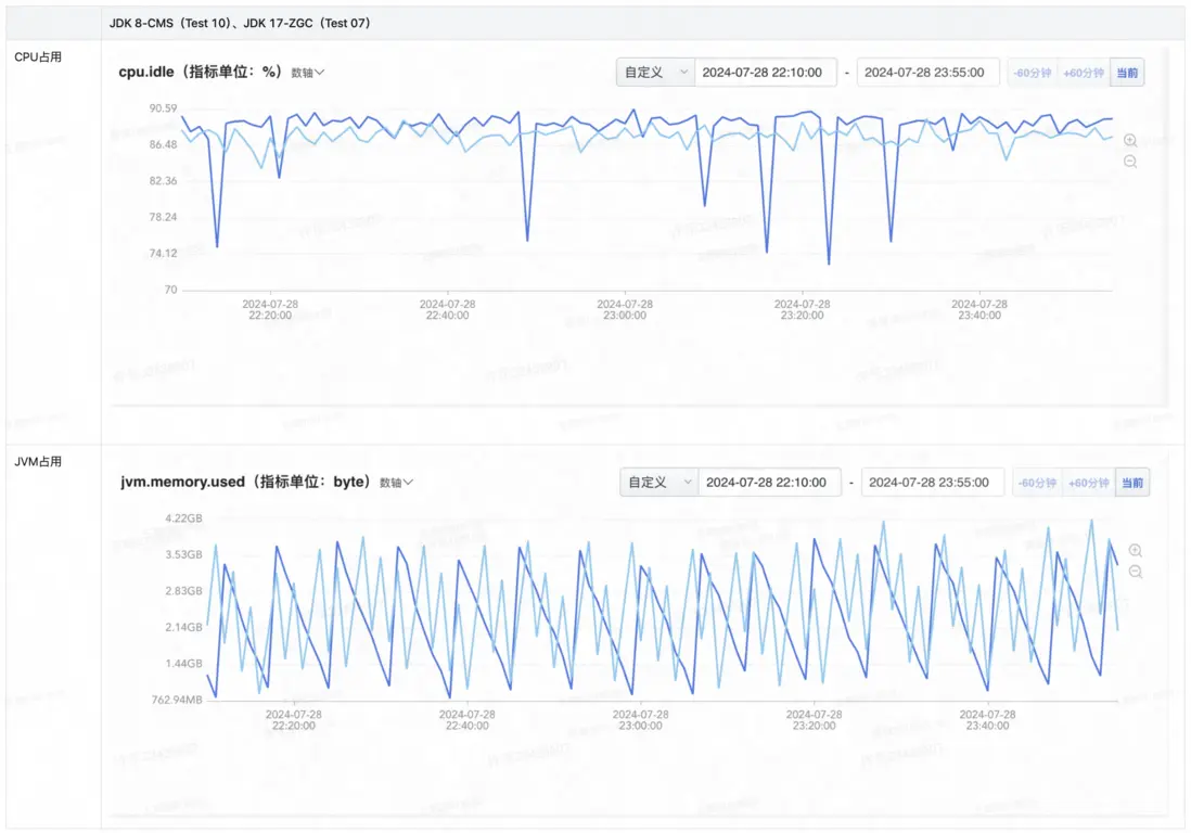 服務升級採用的是Tomcat 9+JDK 17的配置,錄製線上流量進行壓測,使用同樣的流量對先前採用CMS垃圾回收的以及採用ZGC垃圾回收方式的同時進行壓測。服務器配置均為8C16G,800QPS的壓測,通過2h左右的壓測,