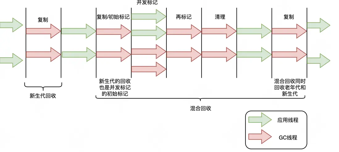 下面以G1為例,通過G1中標記-複製算法過程(G1的Young GC和Mixed GC均採用該算法),分析G1停頓耗時的主要瓶頸。G1垃圾回收週期如下圖所示: