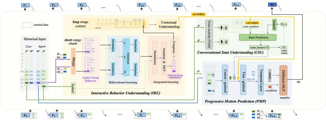 論文簡介:在2D可交互數字人生成任務中,之前研究採用了clip-wise的diffusion生成範式或顯式的聽者/説者切換方法,它們在未來信號獲取、上下文行為理解和狀態切換平滑度方面存在侷限性,難以實現實時性和真實感。本文提出了一種基於自迴歸 (AR) 的逐幀生成框架 ARIG,採用AR+diffusion框架以實現流式實時生成,並充分利用上下文語境和複雜對話狀態理解實現了更高的交互真實感。
