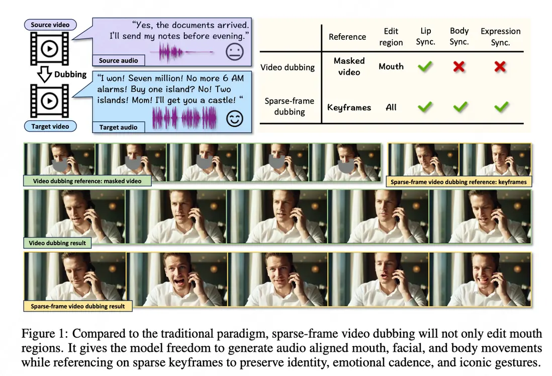 傳統 video dubbing 技術長期受限於其固有的“口型僵局”,即僅能編輯嘴部區域,導致配音所傳遞的情感與人物的面部、肢體表達嚴重脱節,削弱了觀眾的沉浸感。現有新興的音頻驅動視頻生成模型,在應對長視頻序列時也暴露出身份漂移和片段過渡生硬等問題。為解決這些痛點,我們引入並提出了一種全新的技術範式——“稀疏幀 video dubbing”(sparse-frame video dubbing)。