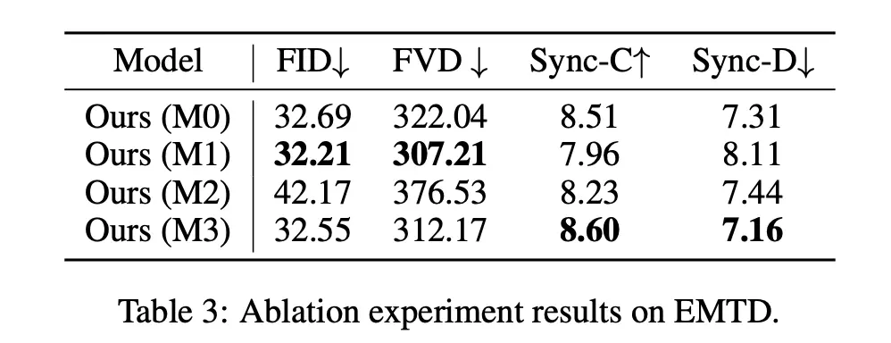 如表 3 所示,M0 策略因隨機採樣而控制強度過高,導致模型不恰當地複製參考動作,削弱了同步性。M1 策略雖然在視覺質量上表現尚可,但在同步性上表現較差,因為它過於嚴格地複製了邊界幀。M2 策略因參考幀與上下文幀的時間距離過遠,導致模型對身份和背景的控制力不足,最終在視覺質量(FID、FVD)上表現最差。