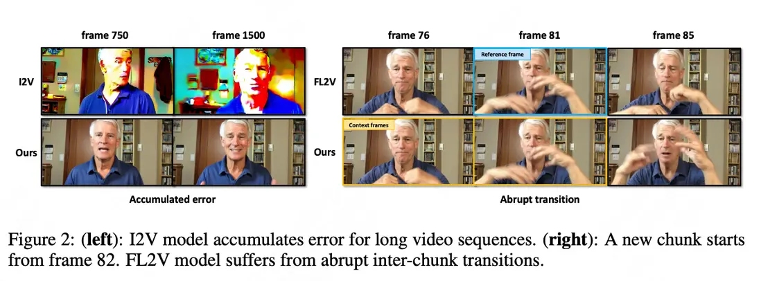 其次是基於首末幀轉視頻(First-Last-frame-to-Video, FL2V)的方法。該方法試圖通過同時使用視頻片段的起始幀和終止幀作為參考來解決累積誤差。然而,這種策略帶來了另一個問題:過渡生硬, 如圖 2(右)。FL2V 模型生成過程缺乏從前一片段向後一片段傳遞的“動量信息”,不同視頻片段之間的動作銜接會顯得突兀和不自然,打破了視頻流的連續性。與此同時,其過於嚴格地遵循固定的參考幀,強制生成的視頻在片段(chunk)的邊界上精確複製參考幀的姿態,即使這種姿態與新音頻的情感或節奏相悖。