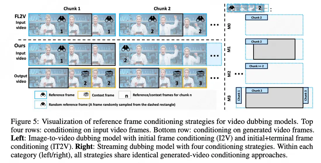 在“稀疏幀 video dubbing”範式下,一個關鍵的挑戰是如何在“自由表達”與“跟隨參考”之間找到微妙的平衡。過於嚴格地複製參考幀(如 M1 策略)會導致生成的動作僵硬,而如果控制過於鬆散(如 M2 策略),則又會面臨身份和背景失真等問題。