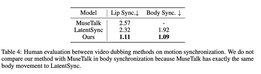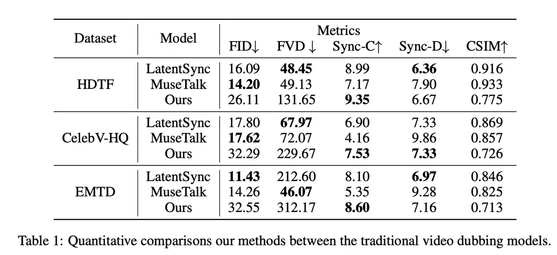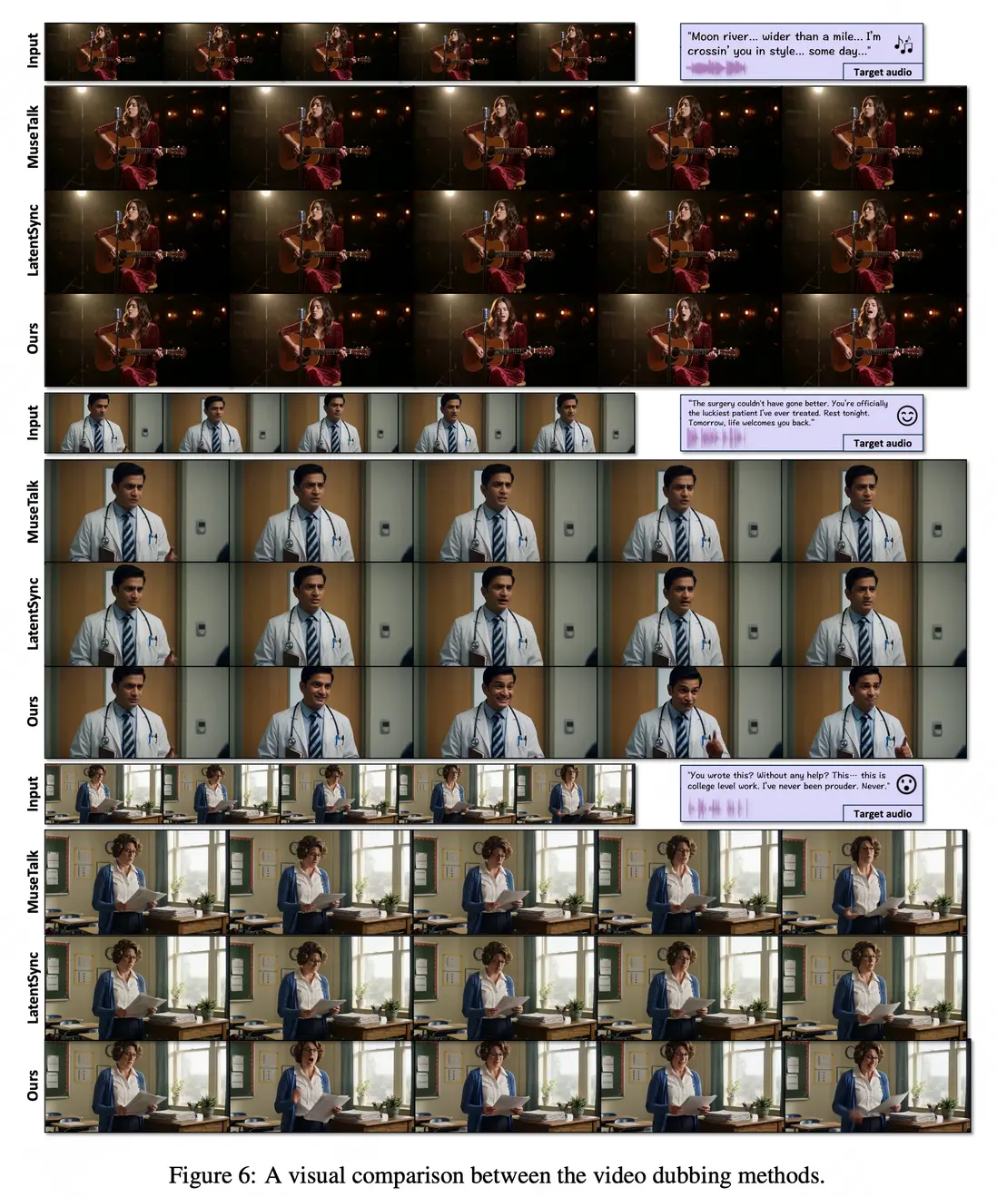 video dubbing 是內容全球化傳播的關鍵環節,它通過將源視頻的音頻替換為新語言的配音,使內容能夠觸達更廣闊的受眾。然而,長期以來,這項技術一直面臨一個核心的“僵局”——其編輯範圍的侷限性。傳統的 video dubbing 技術,例如 MuseTalk 和 LatentSync,通常專注於對嘴部區域進行“修復式”編輯,以實現口型與新音頻的同步。這種方法的主要侷限在於,它幾乎不觸及人物的面部表情、頭部轉動和肢體動作。