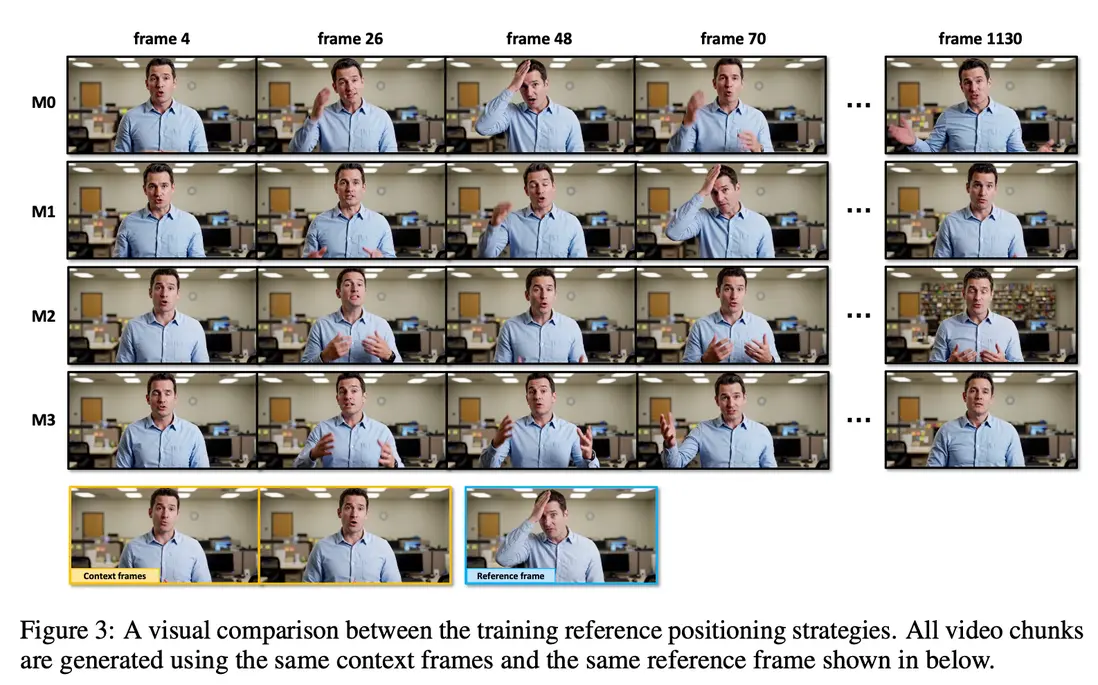 最終被採納的 M3 策略,通過在訓練中從鄰近分塊(adjacent chunks)中採樣參考幀,找到了一個“最優平衡點”(optimal equilibrium)。這種策略既能確保模型在視覺上遵循源視頻的風格,又能賦予模型根據音頻動態生成全身動作的自由。這一核心創新證明了,模型能否成功生成自然動作,其關鍵在於將“控制強度”視為一個可調控的變量,而非固定不變的開關,從而實現了“軟條件”這一創新式的突破。