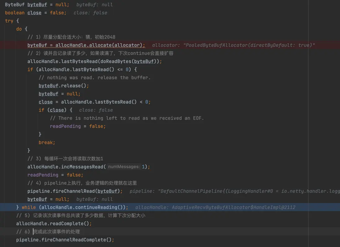 1.進入read()方法,先申請一個byteBuf,初始容量2048,然後循環讀取數據