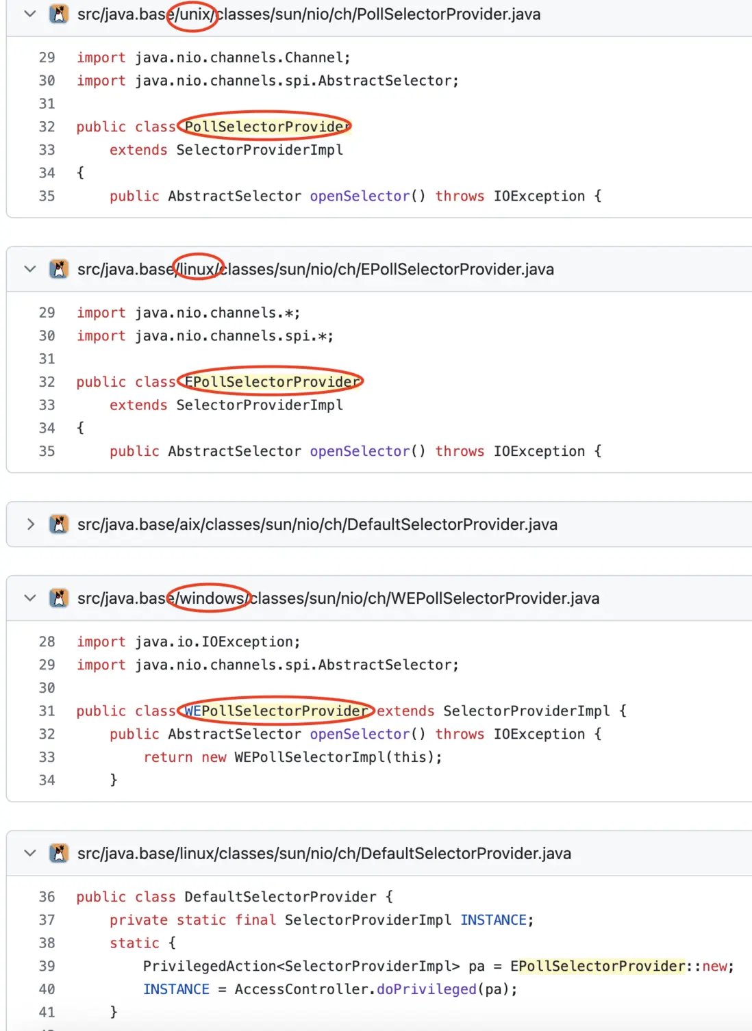 • 如果前兩個都沒有,看第三個sun.nio.ch.DefaultSelectorProvider.create,這個方法是jre虛擬機的方法,不同平台的jdk版本上,該方法不一樣,