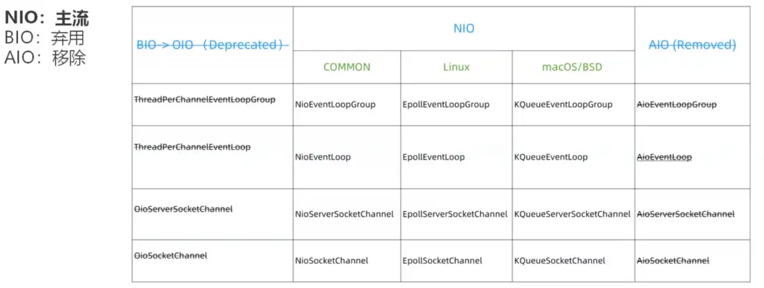 我們看到對三種IO模式的支持,相關的類都加了不同的前綴Oio,Nio,Aio。現在其他IO模式都已棄用,只有支持NIO了。