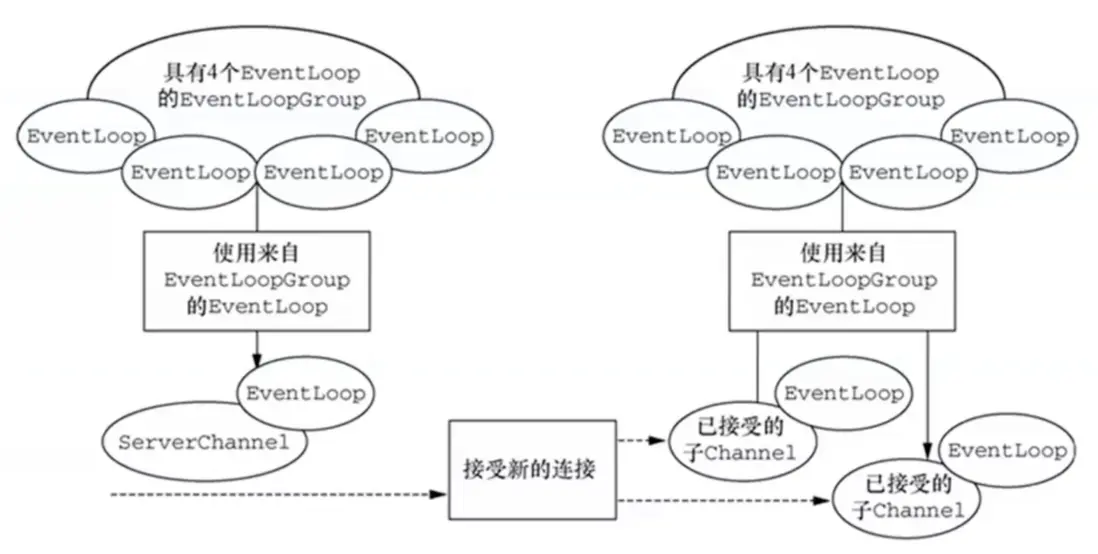 看下圖,EventLoopGroup是線程組,每個EventLoop是一個線程,那麼線程處理請求是怎麼分配的呢?我們看一下源碼