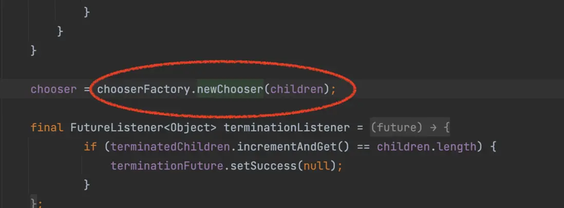點擊chooser,我們找到它賦值的地方在構造方法裏面,chooser的正是通過DefaultEventExecutorChooserFactory的newChooser獲取的,