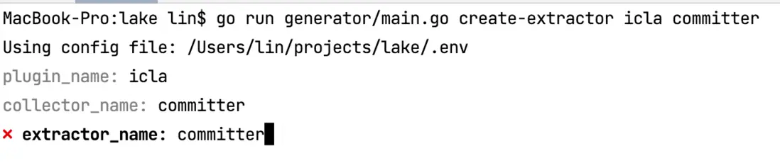 Next, let's run go run generator/main.go create-extractor icla committer and input the UI needed.