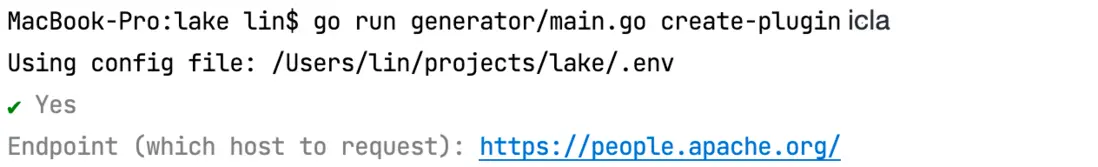 Don't worry about seeing so many concepts at once. we'll explain them one by one. DevLake provides a generator to create a plugin conveniently. Let's scaffold our new plugin by running go run generator/main.go create-plugin icla, which would ask for with_api_client and Endpoint.