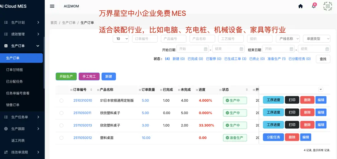根據生產計劃,生成精準的物料需求,並指導倉庫進行準時化配送,避免生產線因缺料或堆料而停滯。系統會對所有關鍵零部件(如壓縮機、主控芯片)進行嚴格的批次和序列號管理,確保每一件物料都能與最終的成品綁定。在組裝工位,萬界星空MES會通過屏幕提示或掃描防錯,指導操作員使用正確的物料,有效避免裝錯、漏裝等人為失誤。 - 生產過程管理