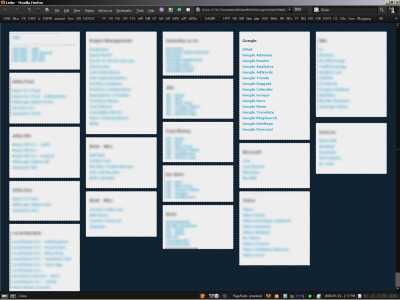 The idea of a home page as a collection of “apps,” or more accurately links to a variety of user-selected websites, was not introduced with either Safari’s or Opera’s first Speed Dial. Computer maven John Dvorak has had a version of his “personal portal home page” available since 1999; all of his iterations use text links only, no icons, for faster loading time. More recently, a developer who blogs at Geniosity wrote about his own handcrafted, text-link driven home page he created for his copy of Firefox (image at left). The author tells me he still uses a version of this for his home page.There are other examples out there for the Googling.