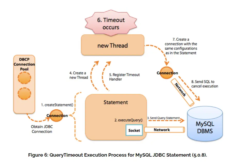 - 超時處理線程創建到數據庫管理系統的連接:The timeout-execution thread creates a connection that has the same configurations as the statement.