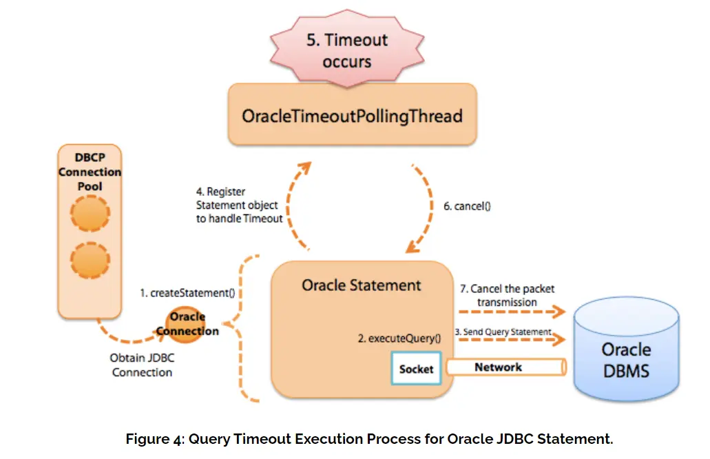 - 註冊該 statement 到超時處理線程 OracleTimeoutPollingThread:The statement registers a statement to OracleTimeoutPollingThread (1 for each classloader) for timeout process.
