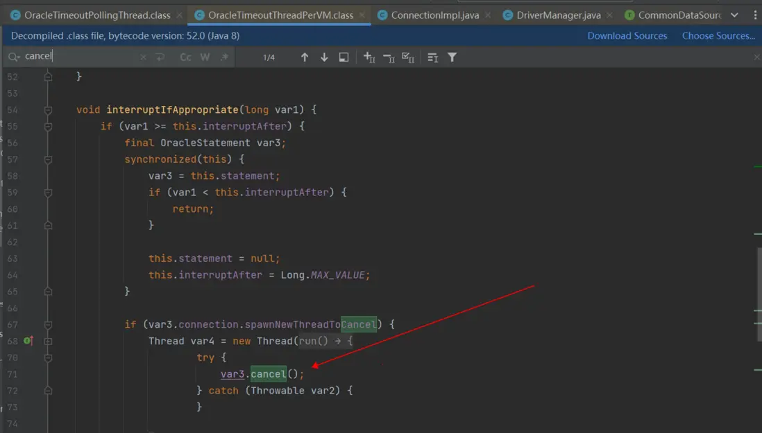 - 超時處理線程調用方法取消語句的執行:OracleTimeoutPollingThread calls OracleStatement.cancel().