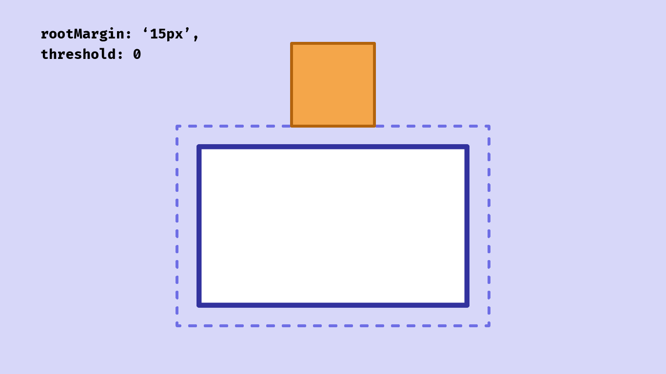 The rootMargin value is a bit like adding CSS margins to the root element — and, just like margins, can take multiple values, including negative values. The target element will be considered to be intersecting relative to the margins.