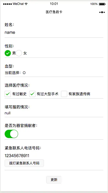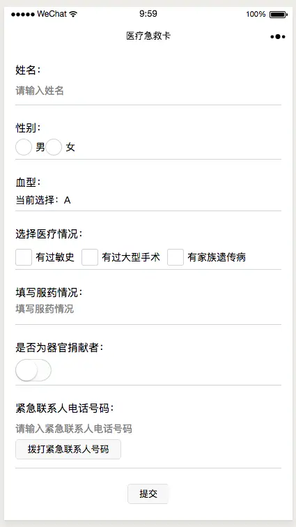 該小程序主要為一個表單的填寫與提交。示例表單的內容包括姓名、性別、血型、醫療情況、服藥情況、是否為器官捐獻者和緊急聯繫人電話號碼。提交成功後表單顯示用户已填寫的信息,如果用户想更新,直接更改表單內容再次提交即可。