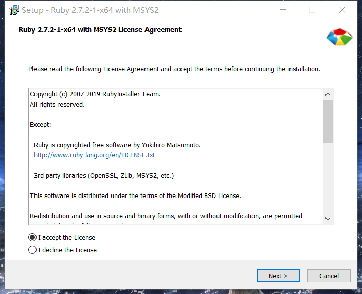 可以下載源碼編譯進行安裝,也可以下載相應的安裝工具進行安裝。博主下載的是windows平台下的ruby2.7.2(x64)+devkit的版本,可以同時安裝ruby和devkit,非常的方便。
