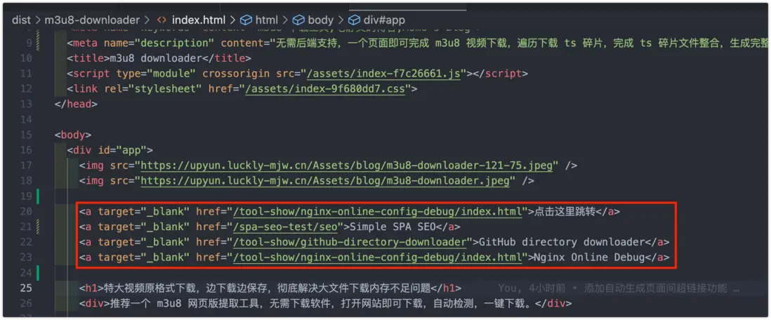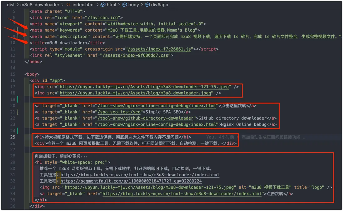 <meta name="description" content="無需後端支持,一個頁面即可完成 m3u8 視頻下載,遍歷下載 ts 碎片,完成 ts 碎片文件整合,生成完整視頻文件。"> - 【img】設置頁面的圖片,實現搜索引擎收錄,展示效果時,展示縮略圖