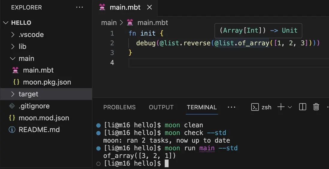 最新的安裝腳本會將標準庫下載到 ~/.moon/lib/core 目錄下。目前標準庫的內容以及相關IDE支持暫不穩定,因此構建系統默認不鏈接標準庫。對於想要提前體驗標準庫功能的開發者們,可以在 moon check|build|run|test 命令後添加 --std 選項用於鏈接標準庫到當前項目。